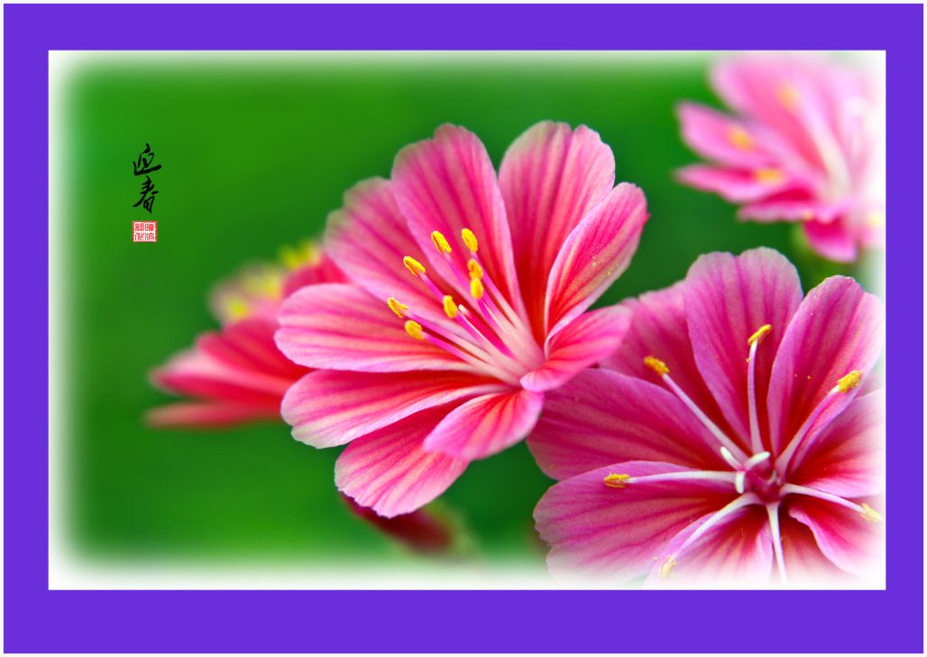 欣賞佳作!花卉取舍布局很美!背景虛化恰到好處, 邊框的色彩可以與物象主色調(diào)接近些,清淡的色調(diào),或就用白色,,,您看怎樣呢? 這紫色太搶眼了,協(xié)調(diào)性差點(diǎn),己見啊,,,, |